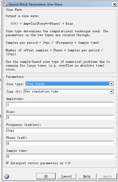 本例设置选择Time based方式,其中一个Sine Wave模块参数设置见图5-4,将产生频率为1Hz的正弦连续时间信号。
