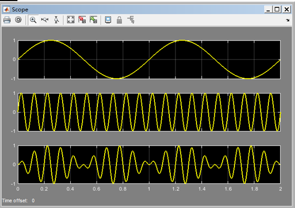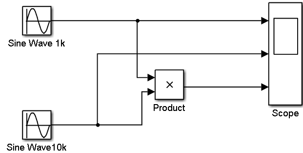 [例5-1]搭建仿真模型,实现两路正弦信号(频率分别为1Hz、10Hz)相乘,显示输出信号。