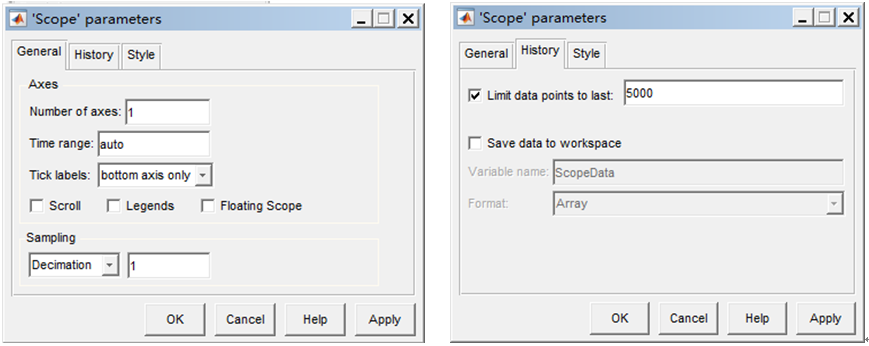 图5-7 Scope参数设置Genetal属性页 5-8Scope参数设置History属性页