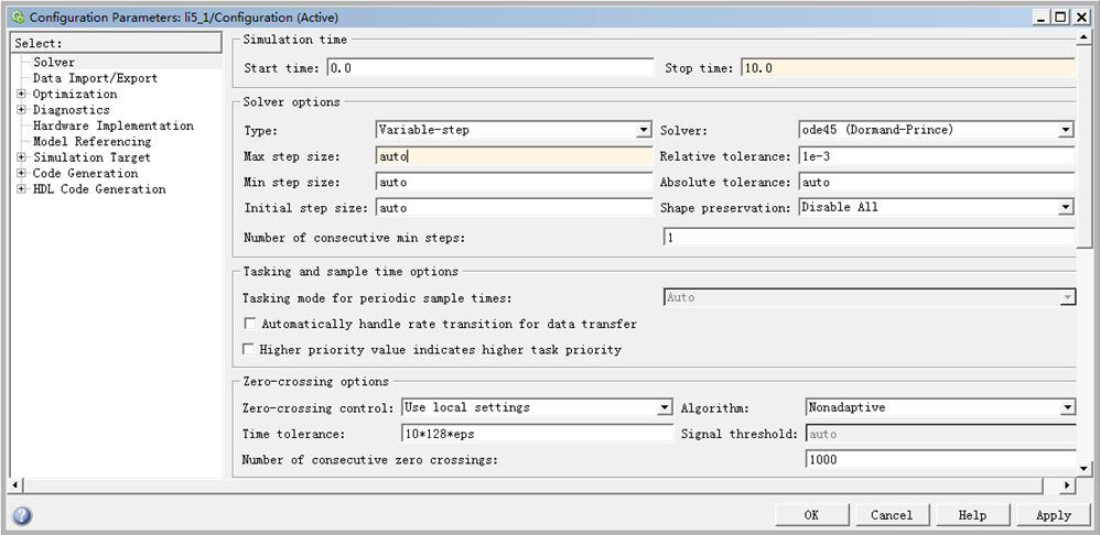 在模型参数设置窗中,左侧树状列表的内容有:解算器(Solver)、数据输入/输出(Data Import/Export)、优化(Optimization)、诊断方式(Diagnostics)、硬件工具(Hardware Implemention)、模型引用(Model Referencing)、仿真输出文件的格式(Simulation Target)、代码生成(Code Generation)和硬件描述语言编码生成(HDL Coder Generation),其中最重要的是解算器。
