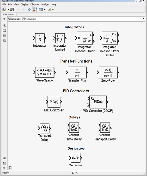 连续模块库(Continuous)中包括了常用的连续模块。此库中所有模块都是假设初始条件为零。