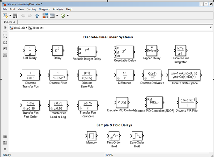 离散模块库(Discrete)内的模块主要用于离散系统的建模,这类系统在时域上一般用差分方程来描述,或者在频域上利用Z变换得到传递函数进行描述。在实际的仿真模型中,各模块的采样时间可能并不一致,通常将这类系统称为多速率系统。