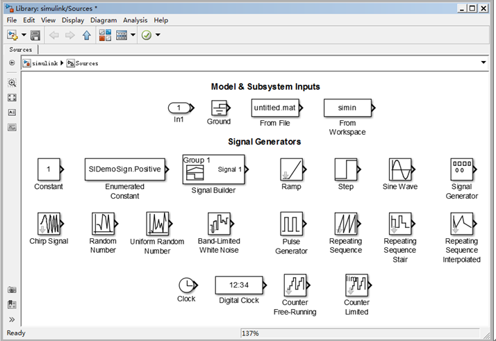 输入源模块库(Sources)内的模块主要用于给Simulink仿真模型提供输入信号。