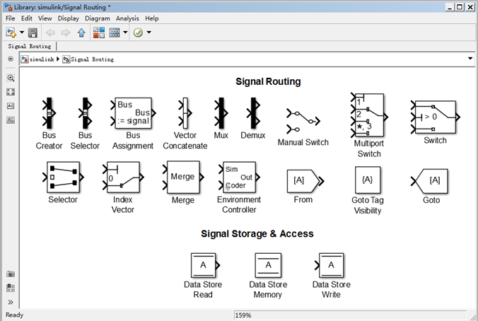 信号模块(Signals Routing)存放了大量的对信号传输路径问题进行处理的模块,如选择开关(交换)模块、复路器、分路器等。
