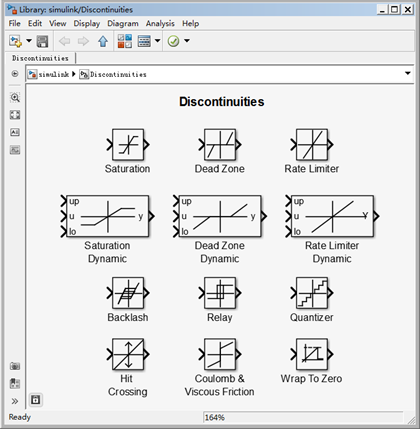 非线性模块库(Discontinuties)在Simulink模块库浏览器中又称为不连续模块库,该模块库主要包含常见的分段模块和非线性静态模块。