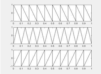 x2=sawtooth(2*pi*10*t,0.5); %若x2=sawtooth(2*pi*t,0.5),则周期为1