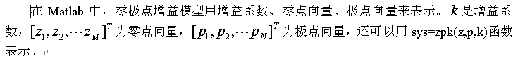 在Matlab中,零极点增益模型用增益系数、零点向量、极点向量来表示。