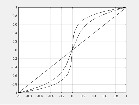 [例9-2] 输出A律压缩系数取不同值的压缩曲线。