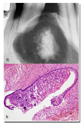 病变呈囊性,衬里上皮的基底细胞呈立方状或柱状,胞核远离基底膜;其浅层由排列疏松的星形细胞构成,类似于星网状层;衬里上皮和纤维囊壁内可见数量不等的影细胞灶,并有不同程度的钙化;邻近上皮基底层下方可见带状发育不良牙本质;有的见有广泛牙硬组织形成,类似于牙瘤。