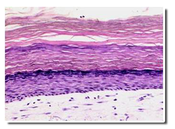 ◇ 光镜观察:衬里上皮厚度一致,5-8层复层鳞状上皮无钉突,上皮表面呈波浪状或皱折状,不全角化,棘细胞层较薄、移行较突然、细胞内水肿,基底细胞层柱或立方状、核远离基底膜、栅栏状,纤维性囊壁较薄,继发感染时表现,纤维囊壁内可见微小的子囊或上皮岛。