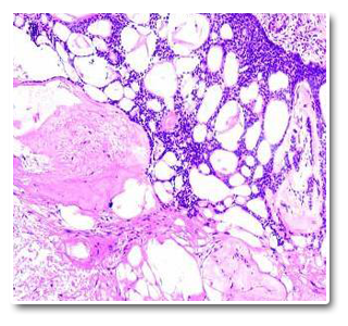 ◇ 结节状实性细胞巢,由梭形或立方状上皮细胞组成,形成玫瑰花样结构。上皮细胞之间以及玫瑰花样结构的中心部可见嗜酸性物质沉积。