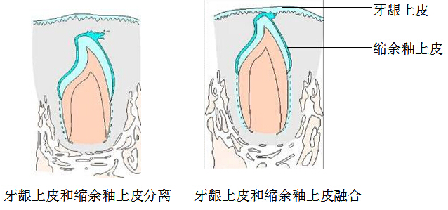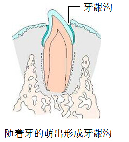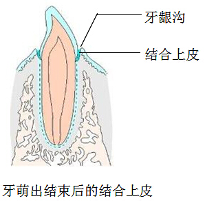 乳牙和恒牙的萌出是相似的,都开始于牙根的形成,持续到牙进入口腔达到咬合接触。在颌骨内,牙根逐渐形成,在牙进入口腔前,牙冠表面被缩余釉上皮覆盖,该上皮能保护牙冠在萌出移动中不受损伤,如果牙冠没有这一保护层,在结缔组织的作用下,釉质和牙本质可被吸收而使牙冠变形。该上皮还能分泌酶,溶解结缔组织,加之萌出时上皮对结缔组织的压力,使结缔组织破坏。这时,随着牙突破骨隐窝以及其上方结缔组织后,缩余釉上皮将与口腔上皮相接触并与之紧密结合成为一融合的双层上皮覆盖在牙冠上方,并移动到退变的结缔组织处,称为上皮袖。该融合上皮在牙萌出的压力下伸展变薄,细胞由于缺血而发生凋亡,形成一个有上皮衬里的牙萌出通道,通过该通道,牙萌出时不会发生出血。