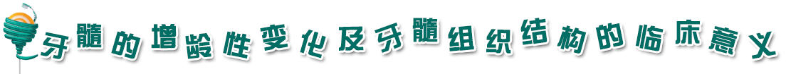 在牙发育完成,即根尖孔形成以后,随着年龄的增长和牙受到外界的生理或病理性刺激,继发性牙本质和(或)修复性牙本质等不断形成,可使髓腔逐渐缩小。同时,牙髓组织中的细胞成分逐渐减少。成牙本质细胞由高柱状变为矮柱状或扁平,部分成牙本质细胞凋亡,剩余的成牙本质细胞对刺激的反应缓慢。成纤维细胞数量减少,同时伴纤维的数量和大小的增加。血管中可出现机体其他部位出现的胆固醇沉积,可使管壁黏附性增加并引起局部炎症反应。牙髓活力降低,出现退行性改变。