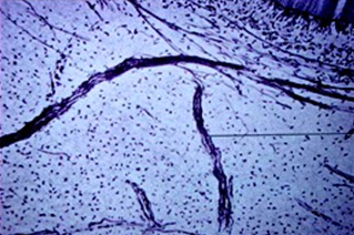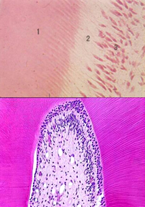 ◇ 紧接着成牙本质细胞层,细胞相对较少的组织为乏细胞层,或称 Weil层 (the zone of Weil),此层约为40μm宽,有血管、无髓神经纤维和纤细的成纤维细胞的突起分布。此层存在与否决定于牙髓的功能状态,在牙本质形成较快和有修复性牙本质形成的区域可能无此层;