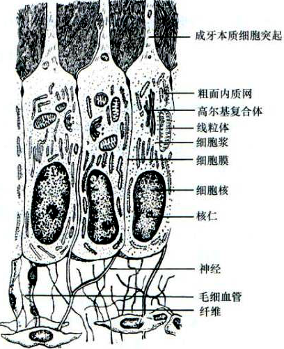 电镜下,成牙本质细胞的胞核位于远离其突起的基底部,核的上方有粗面内质网和高尔基复合体。胞质内线粒体和溶酶体散在分布,还可见其他成分如细胞骨架和分泌泡。在牙本质形成活跃期,细胞内高尔基复合体显著,粗面内质网丰富,线粒体遍布于整个胞质内。