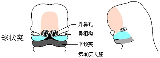 上颌突和球状突融合处开始时为两个突起上皮的接触,形成鼻鳍。为前后走向的垂直的上皮片。