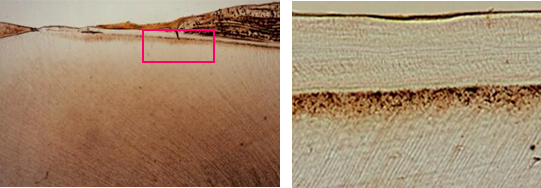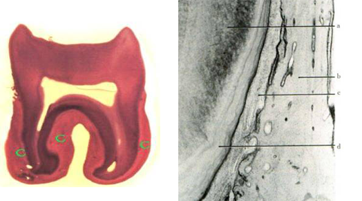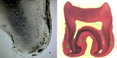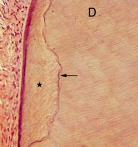 ◇ 牙本质牙骨质界(dentino-cemental junction) 牙本质和牙骨质是紧密结合的,光镜观呈现一较平坦的界线,但电镜下可见该处牙本质和牙骨质的胶原原纤维互相缠绕。