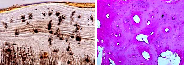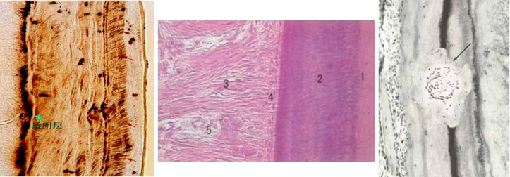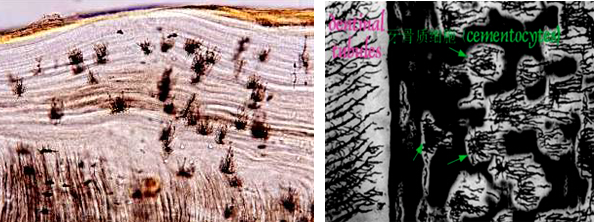 牙骨质的组织学结构与密质骨相似,由细胞和矿化的细胞间质组成。细胞位于陷窝内,并有增生沉积线。但不同于骨的是牙骨质无哈佛管,也无血管和神经。