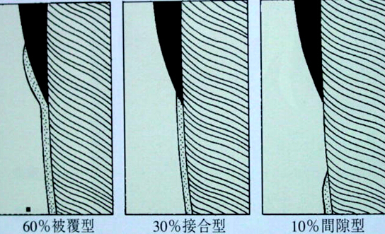 ◇ 釉质牙骨质界(enamelo-cemental junction) 釉质和牙骨质在牙颈部相接,其相接处有三种不同情况:约有60%是牙骨质少许覆盖在釉质表面;约30%是釉质和牙骨质端端相接;还有10%左右是二者不相接,该处牙本质暴露,而为牙龈所覆盖。在后一种情况下,一旦牙龈萎缩,暴露的牙本质易发生过敏。