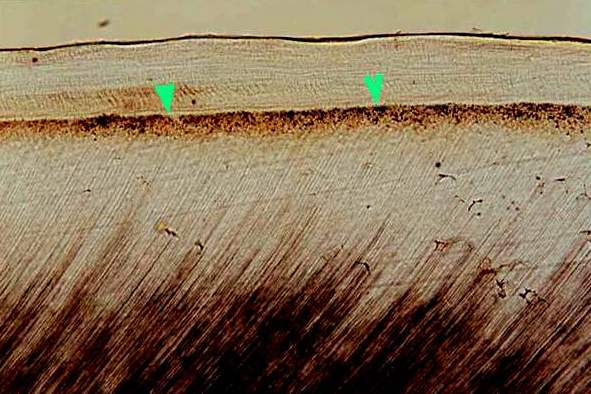 ◇ 牙骨质的表面特点,牙骨质将牙周膜的纤维附着于牙体,因此表面有许多纤维束,分布于整个牙根表面。纤维的分布可呈不均匀性。有些纤维束埋入牙骨质较深,有些较浅。一般情况下,牙骨质越薄,纤维埋入得越浅。这些穿通纤维较骨中的穿通纤维束小。牙骨质表面有时可见吸收区。当吸收停止后,有些吸收区发生牙骨质的修复,这是牙骨质的重要特性。在吸收前沿和修复性牙骨质之间可见反转线(reversal line),意思是吸收过程得到了逆转。乳牙脱落的过程中出现牙根吸收,同时可见局部牙骨质修复现象。这种修复可能在乳牙持续性脱落过程中,给予乳牙某种支持。