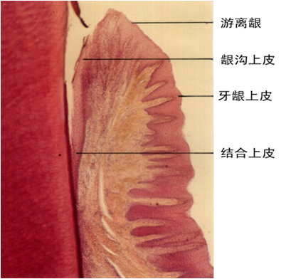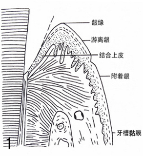 牙龈是口腔黏膜的一部分,由上皮层和固有层组成,无黏膜下层。其中上皮又分为三种功能部分:牙龈上皮,龈沟上皮和结合上皮。它们与结缔组织一起将牙龈附着在牙上。这种特殊的解剖特征称为牙龈结合(dentogingivaljunction)。