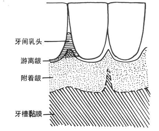 牙龈(gingiva)是包围和覆盖在牙颈部和牙槽嵴的口腔黏膜,呈浅粉红色,坚韧而不活动。在前庭和下颌舌侧面,与红色的牙槽黏膜连续,它们之间有明显的分界线。在上腭与硬腭黏膜连续,无明显分界线。牙龈可分为游离龈、附着龈和牙间乳头三部分。