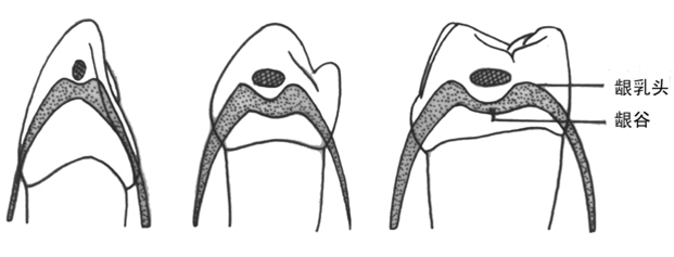 牙龈呈锥体状充填于邻近两牙的牙间隙部分称牙间乳头(interdentalpapilla),也称龈乳头。在后牙,颊侧和舌(腭)侧龈乳头顶端位置高,在牙邻面接触点下相互连接处低平凹下,像山谷故称龈谷(gingivalcol)。在前磨牙区龈谷底形如楔形,在后牙区变为低平。由于该处不易清洁,易形成菌斑和牙石。龈谷易受到炎症刺激,牙间区牙龈炎的发生率明显高于其他部位。在老年和疾病情况下,牙间乳头退缩而将牙间隙显露出来,可引食物嵌塞,导致牙周炎的发生。