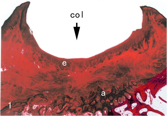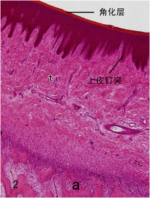 固有层则发育自早期神经嵴细胞迁移形成的间充质,由致密的结缔组织构成。高而长的结缔组织乳头使局部上皮隆起,隆起部分之间的凹陷处,相当于细长的上皮钉突,上皮钉突的表面形成浅凹即为点彩。