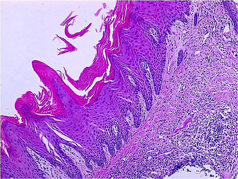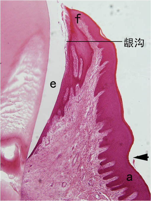 1.牙龈上皮(gingivalepithelium) 上皮层为复层鳞状上皮,表面明显角化或不全角化。上皮钉突多而细长,较深地插入固有层中,使上皮与深层组织牢固地连接。上皮基底细胞生长活跃,偶见黑色素细胞,或含有黑色素颗粒,所以牙龈有时出现黑色斑块。