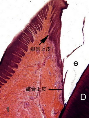 3.结合上皮(junctionalepithelium) 是牙龈上皮附着在牙表面的一条带状上皮,从龈沟底开始,向根尖方向附着在釉质或牙骨质的表面。结合上皮是无角化的鳞状上皮,在龈沟底部约含15~ 30层细胞,向根尖方向逐渐变薄,约含3 ~ 4层细胞。结合上皮细胞呈扁平状,其长轴与牙面长轴平行,无上皮钉突。在与结缔组织的连接处细胞为立方状,类似基底细胞。但如受到刺激,可见上皮钉突增生,伸入结缔组织中。