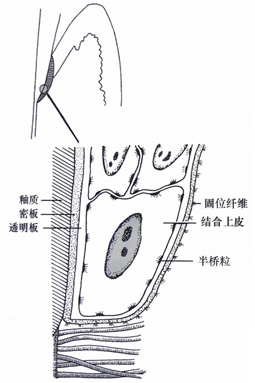 上述形态学特点表明,结合上皮是一未成熟的分化低的上皮,属于简单上皮。从上皮和间充质之间的关系看,支持上皮的结缔组织在决定上皮的表型中起重要作用。上皮下结缔组织对于复层鳞状上皮的正常成熟有诱导作用。而结合上皮下结缔组织缺乏这种诱导作用,致使结合上皮仍保持其不成熟特征。上皮的这种不成熟性表现为,结合上皮形成许多半桥粒,使细胞与牙面紧密附着;结合上皮的表层不易脱落,其更新的细胞移动到牙表面,然后向牙冠方向脱落到龈沟中,而在牙龈上皮中,基底细胞分裂增生补充脱落的表层细胞。另外结合上皮细胞在牙表面产生一种基板样物质(包括透明板和密板两部分),并能通过半桥粒附着在这些物质上,使结合上皮紧密地附着在牙面上。这种结构很类似于上皮与结缔组织连接的方式。