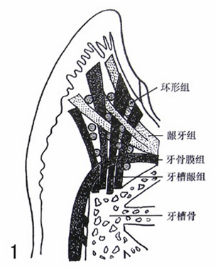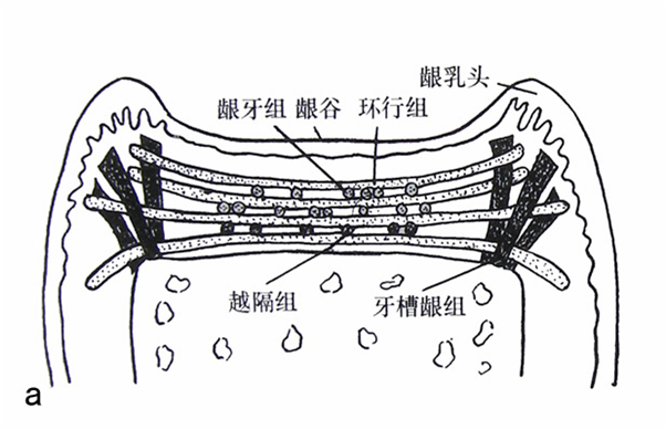 1.龈牙组(dentogingivalgroup) 自牙颈部牙骨质,向牙冠方向散开,止于游离龈和附着龈的固有层,广泛地分布牙龈固有层中,是牙龈纤维中最多的一组。主要是牵引牙龈使其与牙紧密结合。