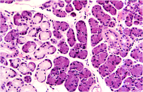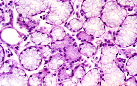 下颌下腺是混合腺,以浆液性腺泡为主,并有少数黏液性腺泡和混合性腺泡。混合性腺泡外周所覆盖的新月形浆液细胞比较小而少。电镜下,下颌下腺浆液性细胞较腮腺者小,底部和侧面细胞膜有许多折叠,与相邻细胞的折叠呈指状交叉。其分泌颗粒除核大于腮腺和舌下腺者外,尚有新月形结构位于颗粒周边部,并紧贴于颗粒膜。此外,闰管比腮腺短,难以辨认。分泌管则较腮腺者长。在下颌下腺导管周围常伴有弥散淋巴组织。皮脂腺亦见于下颌下腺,但较腮腺少。
