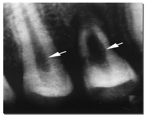有时可见吸收和修复两种情况同时存在。吸收陷窝部分或全部被修复性牙本质或骨样牙本质所替代,部分病例修复性牙本质或骨样牙本质又可出现再一次吸收。可见牙本质吸收陷窝,内有破骨细胞牙内吸收须经根管治疗去除牙髓内肉芽组织才能使吸收停止。严重牙内吸收甚至穿通牙本质和釉质或牙本质和牙骨质。
