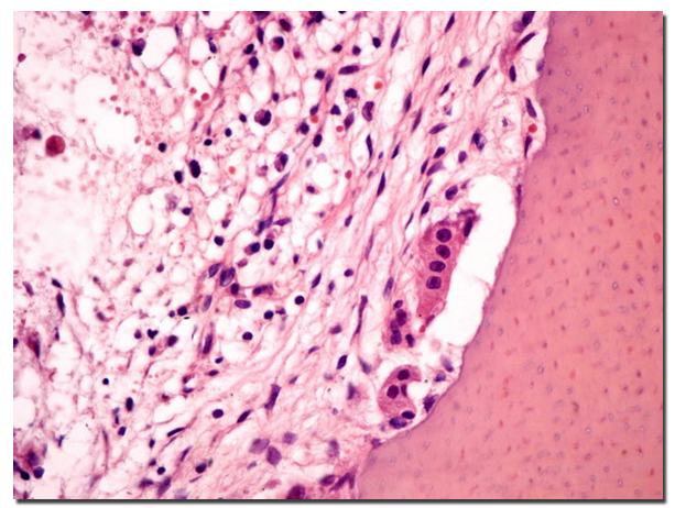 牙髓部分或全部由增生的毛细血管、成纤维细胞和弥漫浸润的中性粒细胞、淋巴细胞、浆细胞和巨噬细胞等构成的肉芽组织取代。成牙本质细胞和前期牙本质消失,牙髓腔面牙本质有不同程度的吸收,呈现不规则凹陷,凹陷内可见胞浆红染的多核