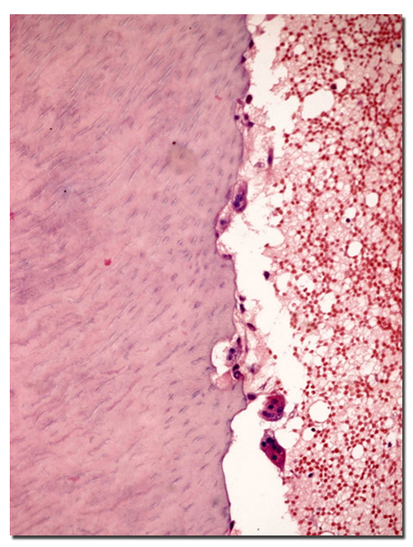 显微镜下,被吸收牙牙根表面出现蚕食状小凹陷。如处于吸收活动期,可见凹陷内有破骨细胞。若吸收相对静止时,则无破骨细胞。若刺激减弱,或机体抵抗力增强时,则吸收陷窝被新形成的牙骨质修复。