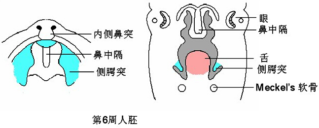 在胚胎第4周末,额鼻突下端出现了鼻板,继而发育为鼻凹,其外侧为侧鼻突。在胚胎第6周时,由于侧鼻突、上颌突向中线方向生长,将中鼻突的两个球状突向中线推移,并使其相互联合,使鼻凹外口不断抬高,变成了一个盲囊,称嗅囊。以后由于嗅囊深部各突起联合部位的上皮变性,嗅囊延长,与口腔直接借口鼻膜相隔,最后与口腔相通。此时,在嗅窝下方,球状突在与对侧球状突及上颌突联合过程中,不断向口腔侧增生,形成了前腭突。前腭突将形成前颌骨和上颌切牙。