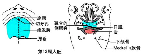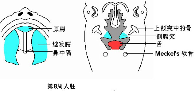 腭是位于鼻腔和口腔之间的组织。在胚胎第六周的时候,前额突和两个侧腭突它们发生风化、融合、联合的过程。