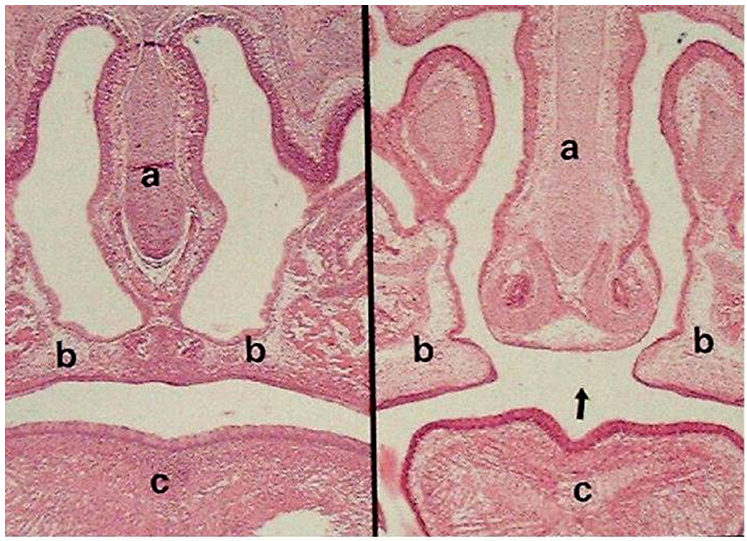 开口反射和外部舌肌的活动参与舌位置的下降。由于HOX基因突变导致的舌骨舌肌功能丧失可使舌的位置偏高,阻碍侧腭突抬高,形成腭裂。两侧侧腭突融合处上皮的间充质转化是腭发育的重要步骤。许多基因(Hoxa1、Hoxa2)和信号分子(TGFβ3、EGF和基质金属蛋白酶)与此种转化有关。TGFβ3通过介导中缝上皮基底膜的消失发挥作用。中缝上皮的中胚层转化需要与细胞外基质接触,此时上皮的基底膜可能是一个物理障碍。TGFβ3裸突变时,可见动物中缝上皮的基底膜不消失,并发生腭裂。在表皮生长因子受体(EGFR)缺陷的小鼠,可见中缝上皮残留较多,由EGFR调节的基质金属蛋白酶表达下降,并有腭裂形成。说明EGF可增强中缝处基质金属蛋白酶的表达,而此酶对中缝上皮的中胚层转化是必需的。Shh在外胚层上皮中的表达可能也与中缝上皮的转化有关。