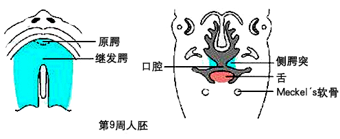 胚胎第8周,由于下颌骨长度和宽度增加,头颅由于发育向上抬高以及侧腭突内的细胞增殖等因素使舌的形态逐渐变为扁平,位置下降;侧腭突发生向水平方向的转动并向中线生长。侧腭突的转动过程通常包括侧腭突和舌的协调运动: