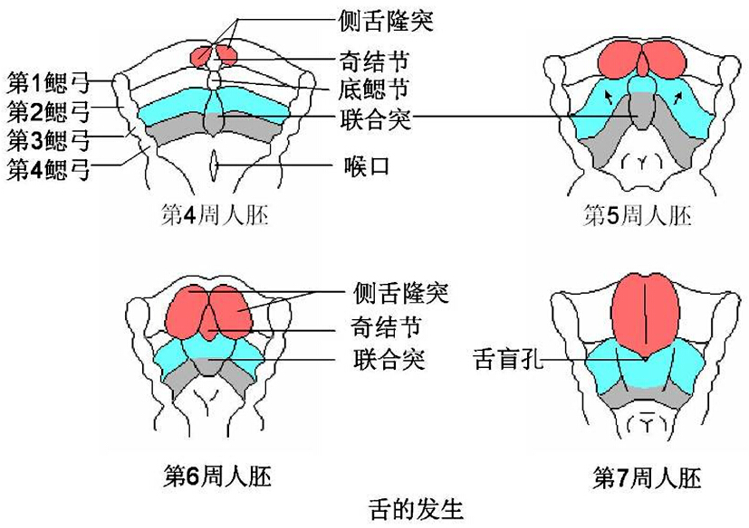 舌发育自第1、2、3鳃弓的原始口腔和咽侧形成的隆起。在胚胎第4周时,两侧第1、2鳃弓在中线处联合。此时,在下颌突的原始口腔侧,内部的间充质不断增生,形成3个膨隆的突起。其中两侧两个对称的隆起体积较大,称侧舌隆突(laterallingual prominence/swelling);在侧舌隆突稍下方中线处为一个小突起,称奇结节(tuberculum impar)。约在胚胎第6周,侧舌隆突生长迅速,很快越过奇结节,并在中线联合,形成舌的前2/3即舌体。奇结节由于被侧舌隆突所覆盖,仅形成盲孔前舌体的一小部分,或退化消失,不形成任何结构。