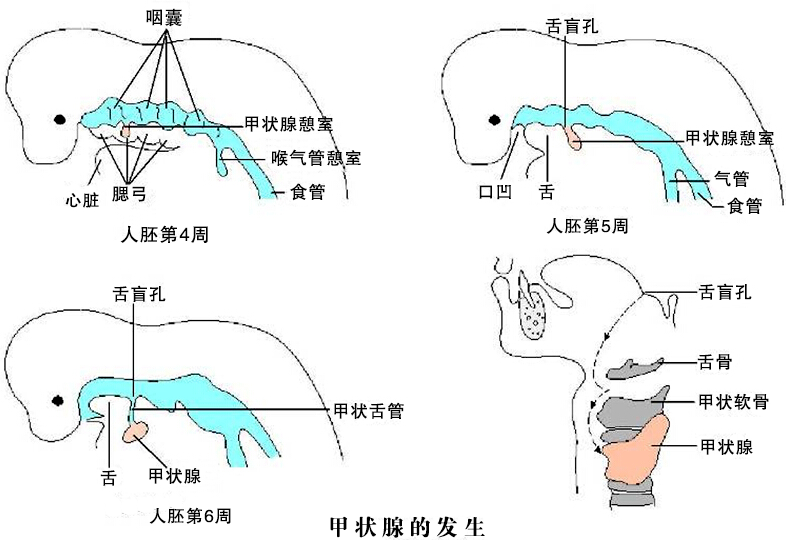 甲状腺早期发生过程中,在甲状腺始基形成的甲状舌管至甲状软骨的下降过程中如发生停滞,则形成异位甲状腺,常见于舌盲孔附近的黏膜下、舌肌内,也见于舌骨附近和胸部。多数异位甲状腺位于中线上,少数可偏离中线甚至偏离较远。如在下降过程中只有部分甲状腺始基滞留,则形成异位甲状腺组织,可出现在喉、气管、心包等处。如甲状舌管未退化,其残留部分可形成甲状舌管囊肿。