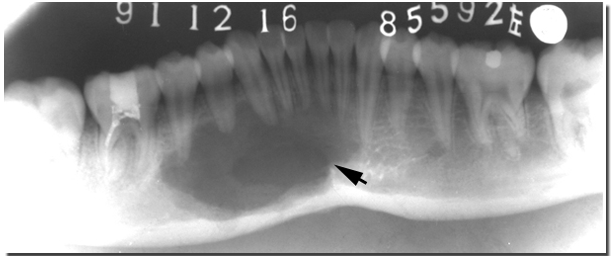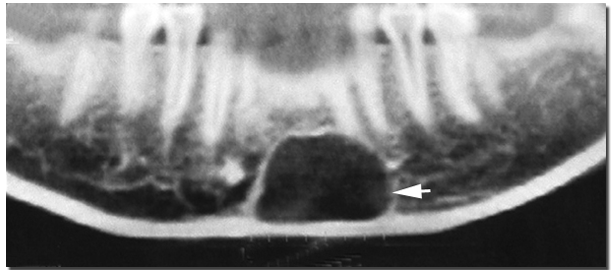 本囊肿好发于长骨,颌骨少见,其发生率约占颌骨囊肿的1%。多发生于青年人,75%患者在10~20岁之间,男性多见。颌面部多发于下颌骨的双尖牙和磨牙区,上颌极为少见。大多数囊肿为单发,也可发生于颌骨双侧。临床上多无症状,常在X线检查时偶然发现,有时可表现颌骨膨胀及疼痛,邻近牙是活髓牙。X线表现为境界较清楚的单房性透射区,边缘较薄的硬化带。牙根吸收和牙移位少见,病变区牙周膜和硬骨板完整。