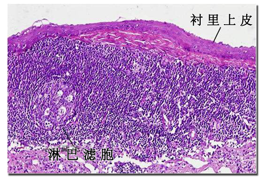 囊肿一般发生于单侧颈部,少数情况下,双侧颈部可同时发生囊肿。囊肿内含物为黄绿或棕色清亮液体,或含浓稠胶样、粘液样物。组织学上,90%以上的囊壁内衬复层鳞状上皮,可伴或不伴角化,部分囊肿可内衬假复层柱状上皮,纤维囊壁内含有大量淋巴样组织并形成淋巴滤泡。第一鳃裂囊肿的囊肿壁内缺乏淋巴样组织,与表皮样囊肿相似。