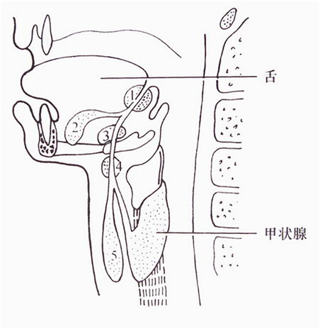 胚胎第4周时,原始咽底部,第一和第二鳃弓之间,内胚层上皮增殖内陷形成一向下行的袋状突出物即甲状腺始基,这个部位就是以后的舌盲孔处。甲状腺始基下行过程带有中空的管即甲状舌导管。胚胎第6周时此管开始退化,第10周时此管消失。如甲状舌导管不消失或发育异常可导致各种病损,如甲状舌管囊肿、甲状舌管瘘或甲状腺迷走组织等。