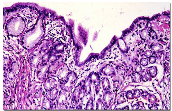 组织学上,囊肿衬里上皮主要为复层鳞状上皮,部分上皮为胃肠道粘膜上皮,可类似于胃体和胃底粘膜,含壁细胞、主细胞、胃腺和肌膜等,有时囊肿衬里还可含肠粘膜或阑尾粘膜上皮。