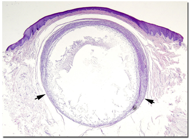 角化的复层鳞状上皮衬里,结缔组织囊壁内没有皮肤附属器者称为表皮样囊肿;若囊壁内含有皮肤附属器,如毛发、毛囊、皮脂腺、汗腺等结构,则称为皮样囊肿。囊腔内为排列成层的角化物质,偶见钙化。角化物质破入周围纤维组织内时,可见异物巨细胞反应、炎症细胞浸润及胆固醇结晶。