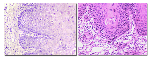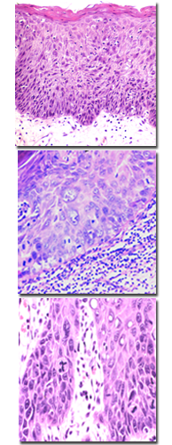 ★ 核仁增大;细胞黏着力下降;在棘细胞层中单个或成团细胞角化。并不是以上12项均出现才诊断为上皮异常增生,根据以上项目出现的数目,而分为轻、中、重度上皮异常增生。