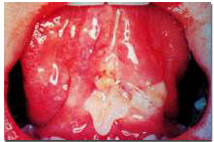 假膜(pseudomembrane)也称伪膜,为灰白色或黄白色的膜。在溃疡的表面常有假膜形成,假膜由炎症渗出的纤维素形成网架,将坏死脱落的上皮细胞和炎症渗出的细胞聚集在一起而形成。假膜不是组织本身,所以能擦掉或撕脱,不过在不同疾病或疾病的不同阶段撕脱有难易之分。而黏膜的角化病变也为白色但不能撕脱,因此,在临床上可以将假膜与白斑等角化情况区别。