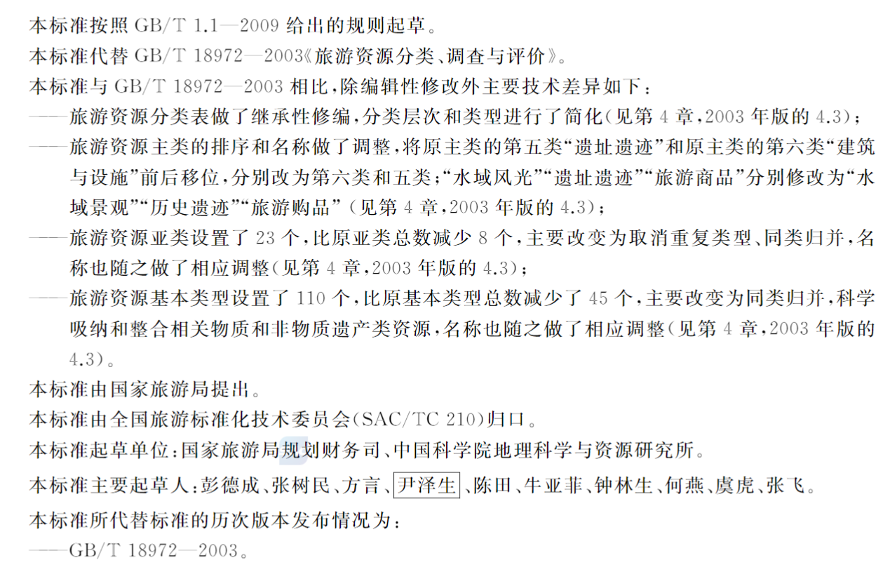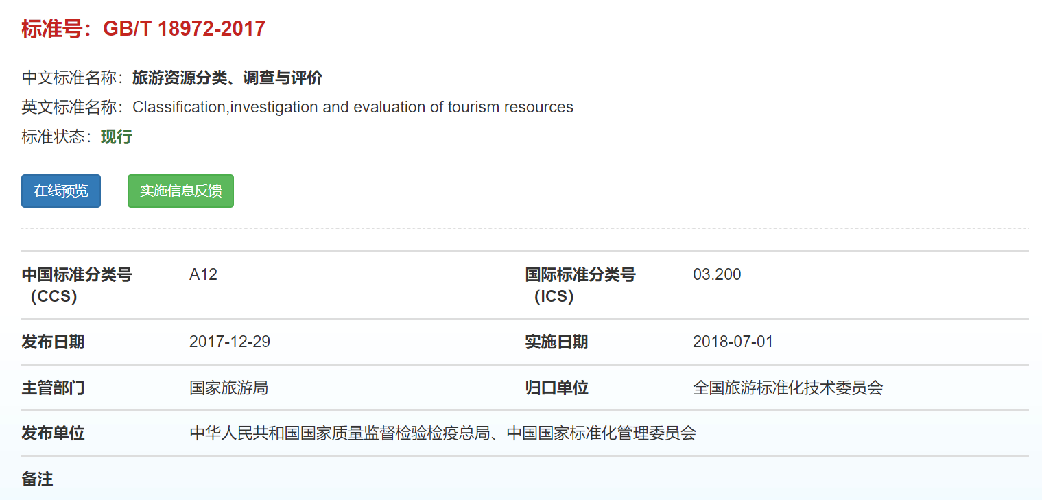 2017年,中国科学院地理科学与资源研究所和国家旅游局规划发展与财务司共同制定的《旅游资源分类、调查与评价》国家标准。